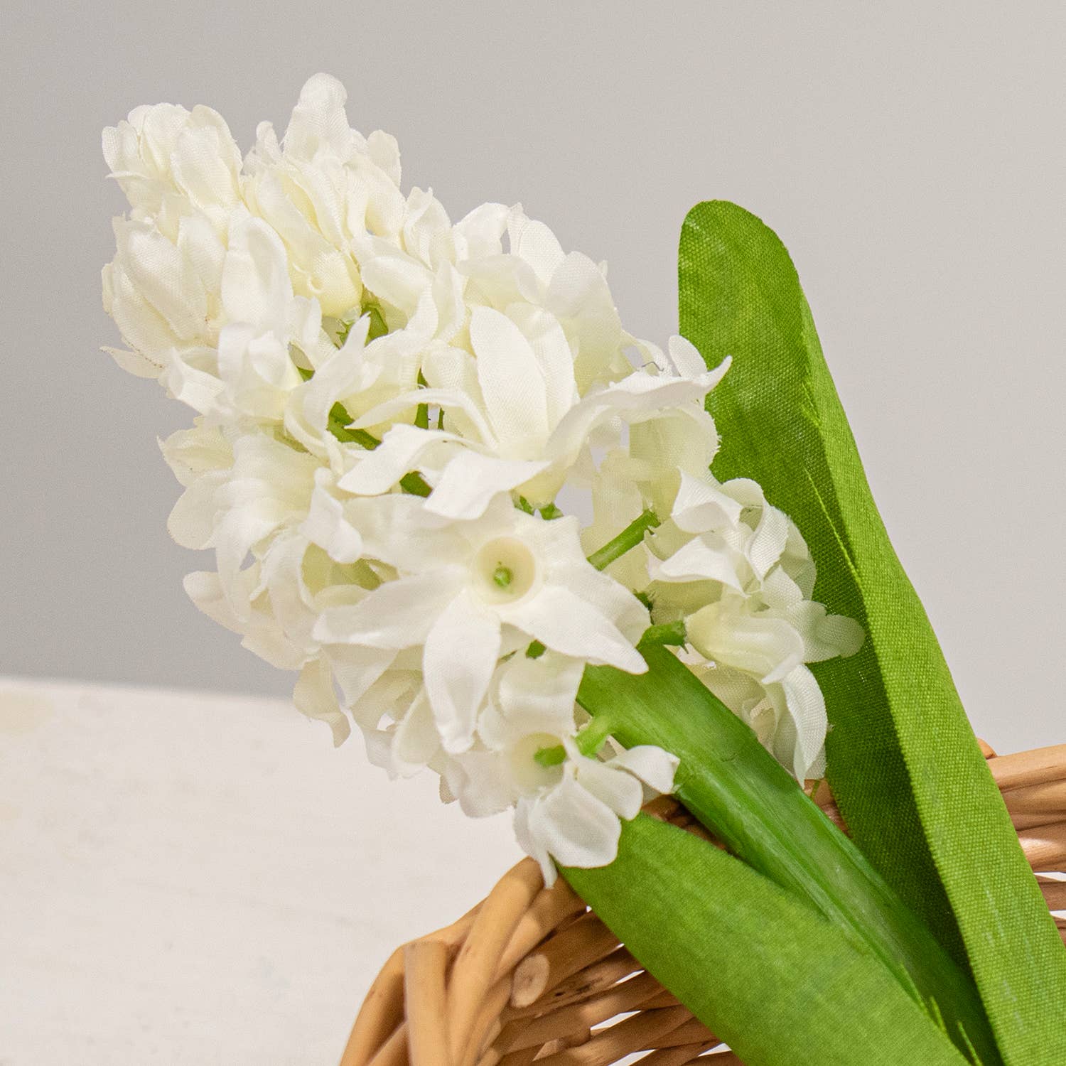 The White Hyacinth Stem brings a fresh floral accent to spring or everyday decor. The thick plastic stem features two long fabric leaves that fade from green to yellow. Small flowers at the top of the stem feature a soft feel and white hue. The stem makes the perfect addition to a decorative vase, can, or bucket or can be set on a flat surface. Measures 11” high by 2.5” in diameter.